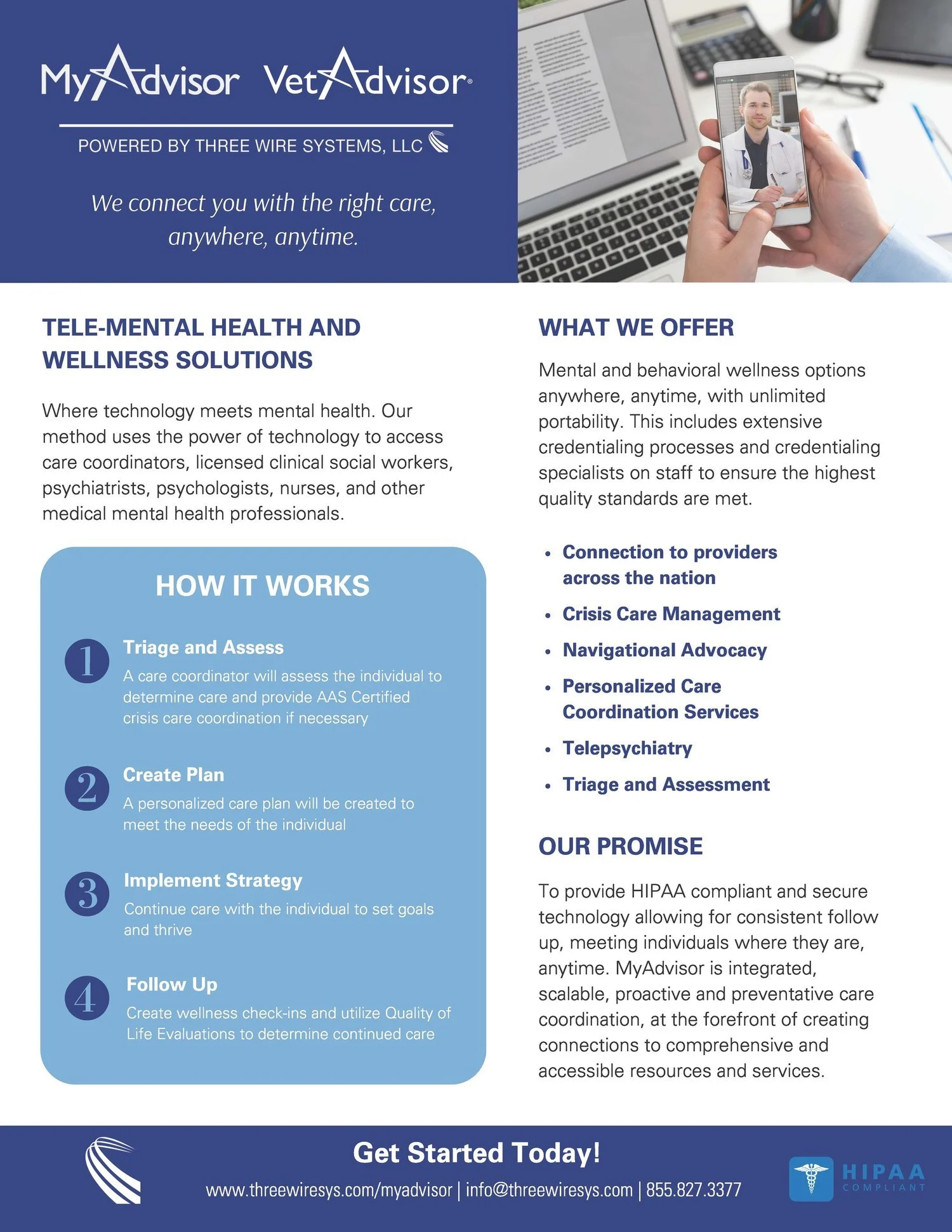 Three Wire designed our solution to be in line with the VA’s “Anywhere to Anywhere” model. With two 24/7/365 contact centers the MyAdvisor Division of Three Wire could establish a mental health workflow, provide extensive training through our MyAdvisor/VetAdvisor University, utilize national licensure and credentialing experience, and create comprehensive mental health results relying on over 12 years of experience and over 5 million care sessions working with the VA.